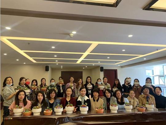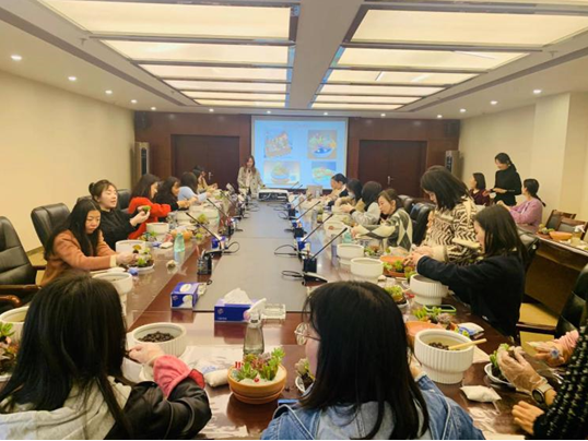 3月8日上午,36名女職工齊聚916會議室。工會副主席陳衛(wèi)東同志首先致辭,給全體女職工送上親切的慰問和祝福。接下來,開展了多肉植物知識科普、有獎?chuàng)尨鸷团杈爸谱骰顒?。活動中,女同胞們互相交流互動,一步一步?chuàng)作自己的盆景作品。
